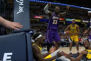 GIF-詹姆斯欧洲步 指着步行者摔倒的两人嘲讽