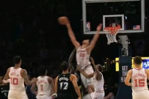 火箭森林狼比赛常规时间最后时刻,森林狼发球前犯规,杜兰特罚球追平,随后握有绝杀机会,但传球失误,森林狼反击,申京回防高高跃起血帽扇出兰德尔的上篮,拯救比赛,将比赛拖入加时。
