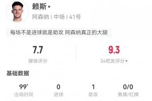 体育资讯2月19日讯 阿森纳在本轮英超对阵狼队,赖斯本场数据如下: