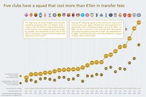 紧随其后的是曼城,蓝月亮的阵容花费15.84亿欧。此外,曼联(13.12亿欧)、阿森纳(11.02亿欧)以及皇马(10.74亿欧)的阵容支出均超过10亿欧。