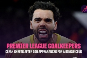 在英超门将代表单一俱乐部出战100场比赛的零封统计中,拉亚与范德萨并列第六,切赫代表切尔西出战100场后零封59场排名第一。