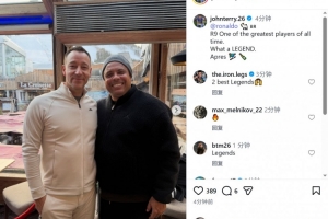 特里社媒晒出与大罗的合照,配文:“罗纳尔多,有史以来最伟大的球员之一,真是一位传奇!”